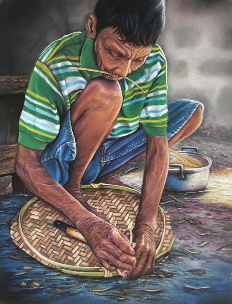 Tatang is a farmer but also spends his time weaving “bilao”. After doing his morning chores, he would go home immediately, rest and start weaving bilao. Since Tatang was young, he was trained to learn to weave “bilao” where this art has always been an element of traditional lifestyles. Tatang takes more time to prepare the materials, using knives to split the bamboo stalks into dozens of different sizes and finely smoothened strips. He believes that weaving “bilao” is one of his essential incomes that could provide cash to buy necessities for his family especially during this time of pandemic.