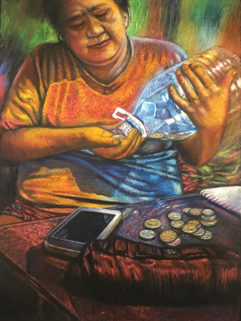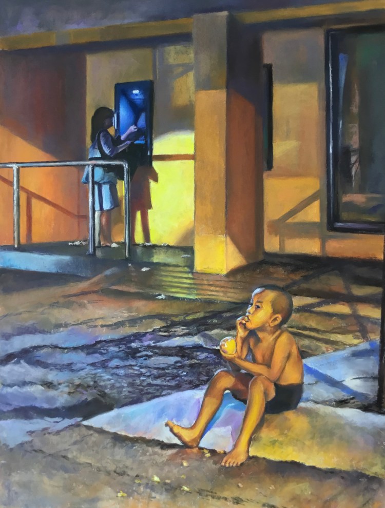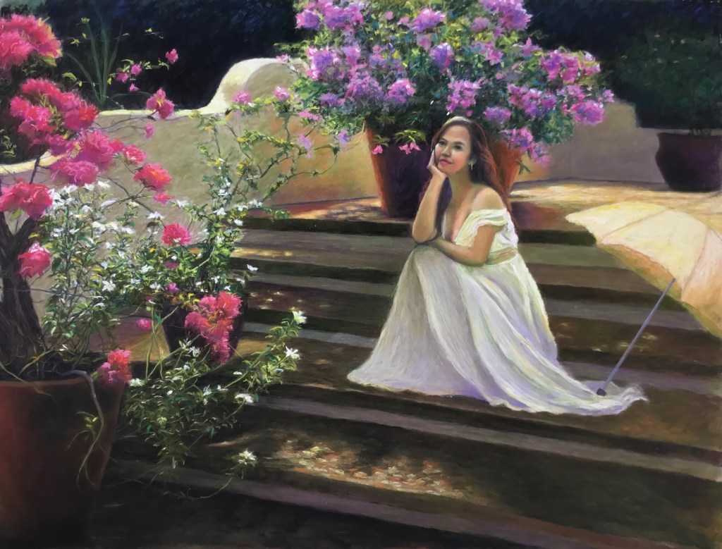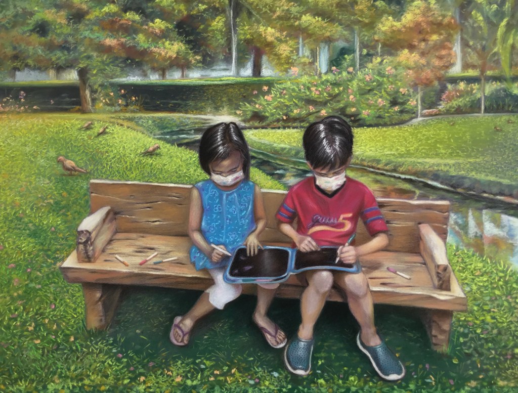 In this time of the pandemic, we have been confined inside the house. We missed the outdoors, especially doing something ordinary such as walking in the park, experiencing nature or smelling the flowers. The painting depicts an ordinary day, but is now more meaningful especially when we are once again free to roam the world.