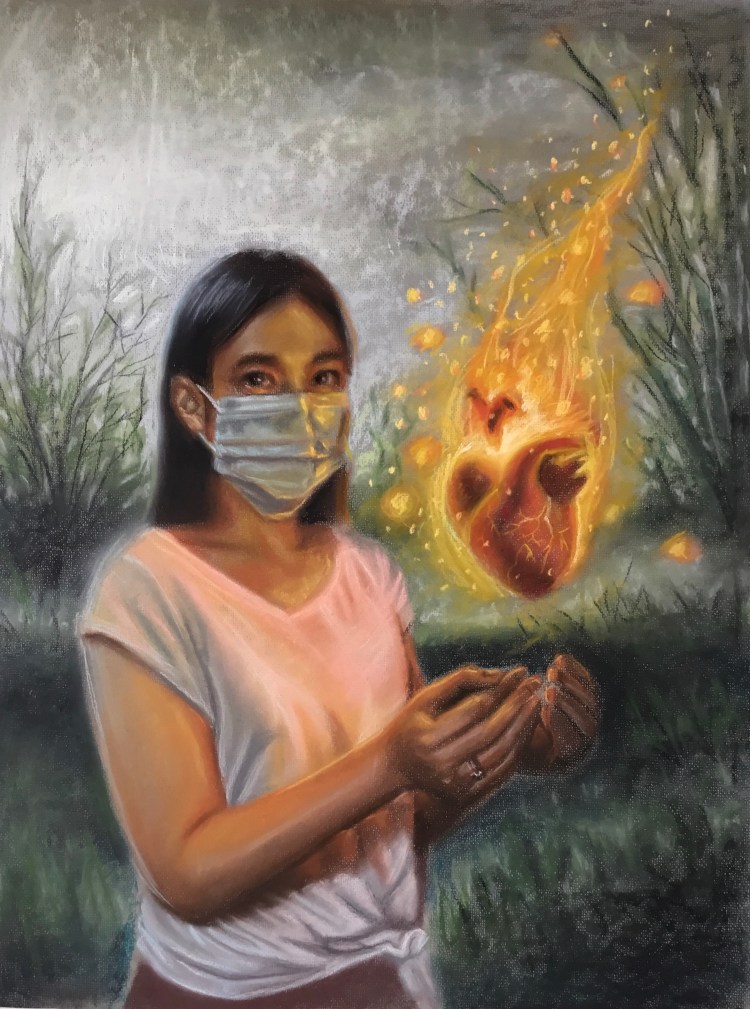Metanoia is a Latin word that means “change of heart” or spiritual conversion. I painted this artwork based on my realizations about this recent pandemic event, wherein many people have also been affected and changed their personal views in life. I see that our emotional health must come first before anything else, and it is genuinely a massive impact in our daily lives and even in the success that we are aiming for as goal-oriented beings. Materialistic things themselves aren’t enough to help our emotional and spiritual needs leading to confusion about what is necessary.