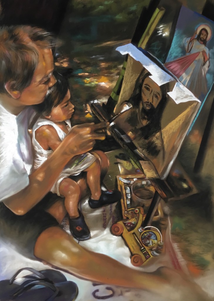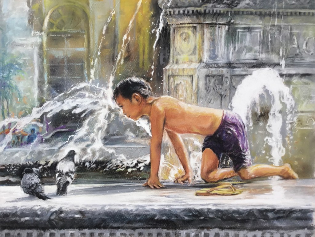 This scene caught my interest while on a photo shoot on the way to LRT Station from Binondo. I saw a bunch of street kids (mga batang hamog) playing with the splashing water from Carriedo fountain in front of Sta. Cruz Church. The boy is crawling on the act of catching something. I thought of a good idea and subject for a painting so I took several shots of them and composed it with two doves from my archive. The boy is trying to catch two resting doves on the platform of the fountain.