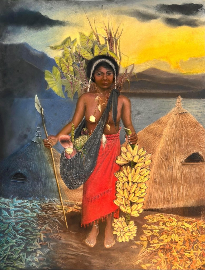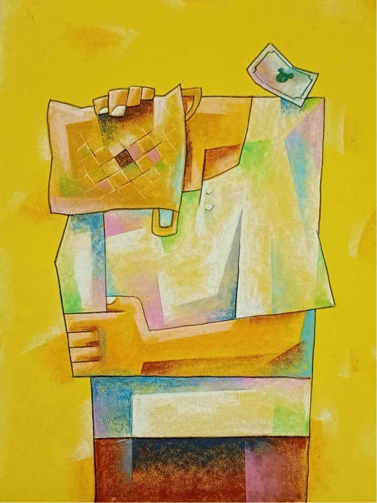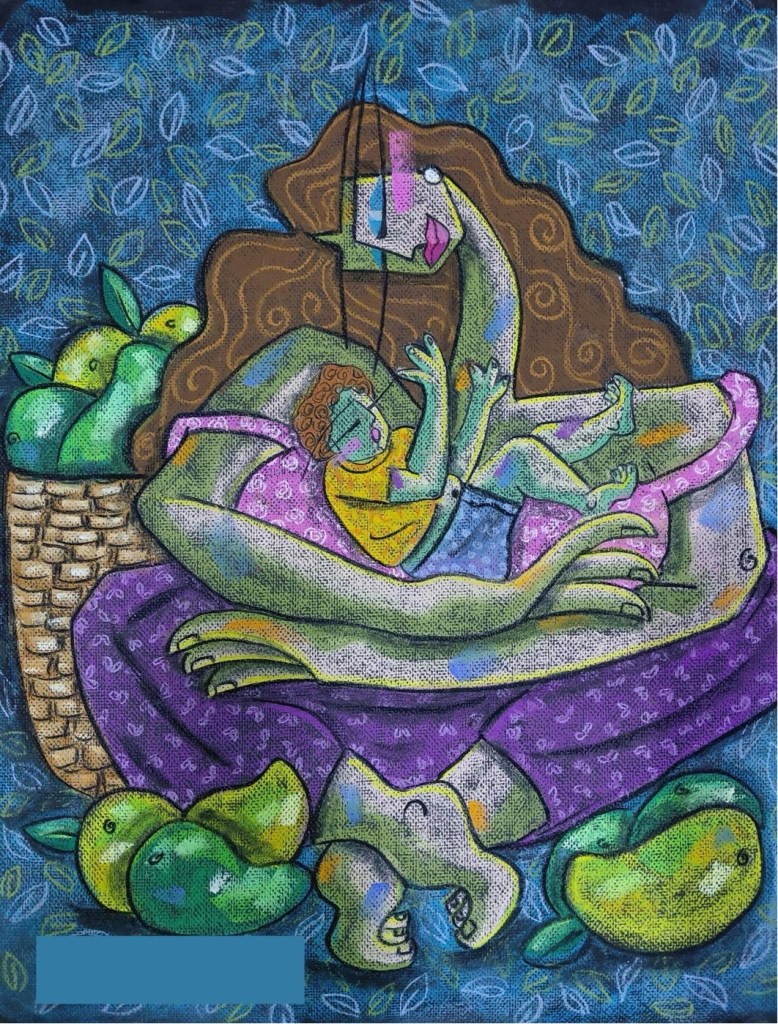 In the Chilly smoked filled city streets, a mother, with closed eyes, surpassing the boundaries of her face, cradles her young child while minding her little fruit store. Her face shows femeninity while wearing a bright pink off-shoulder top. Her facial expression shows content inspite of her daily hard work. A bright pearl and splash of pink on her cheek finishes the painting. A splash of yellow with a touch of green is applied to reflect the freshness of the mangoes.