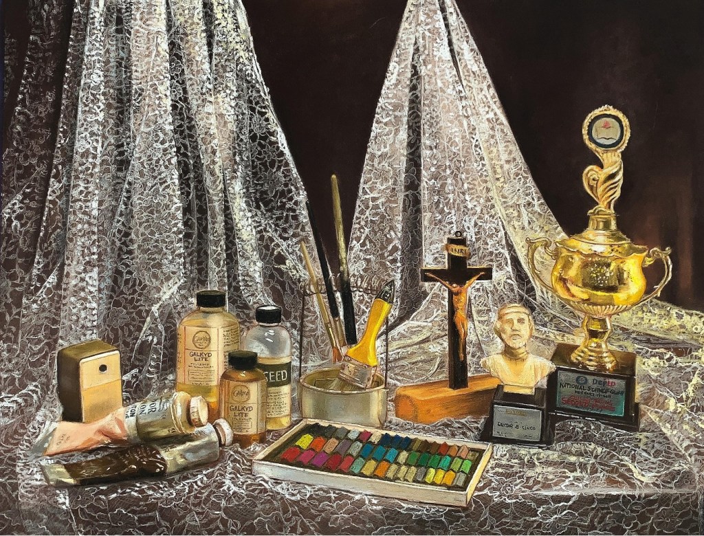 Ang “Mga Sandata at Pananalig” ay isang likhang-sining na sumasalamin sa ugnayan ng pananampalataya at pagkamalikhain. Ang mga gamit pangsining tulad ng chalck pastel, pintura, lapis, at brush ay nagsisilbing sandata ng isang alagad ng sining sa pakikibaka ng kanyang paglalakbay. Kaakibat nito ang krus at mga tropeo na sumisimbolo ng pananalig, lakas ng loob, at bunga ng tiyaga. Ang telang puntillas ay larawan ng kahinaan at tibay ng loob isang paalala na sa likod ng bawat tagumpay ay may dasal at sakripisyo. Sa kabuuan, ito’y patunay na ang sining ay panalangin at laban na sabay na pinaninindigan.