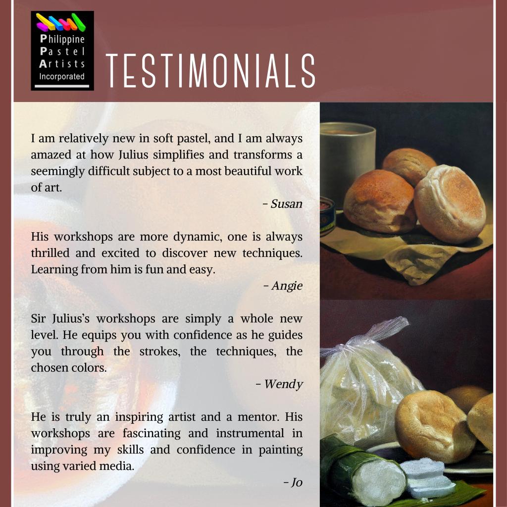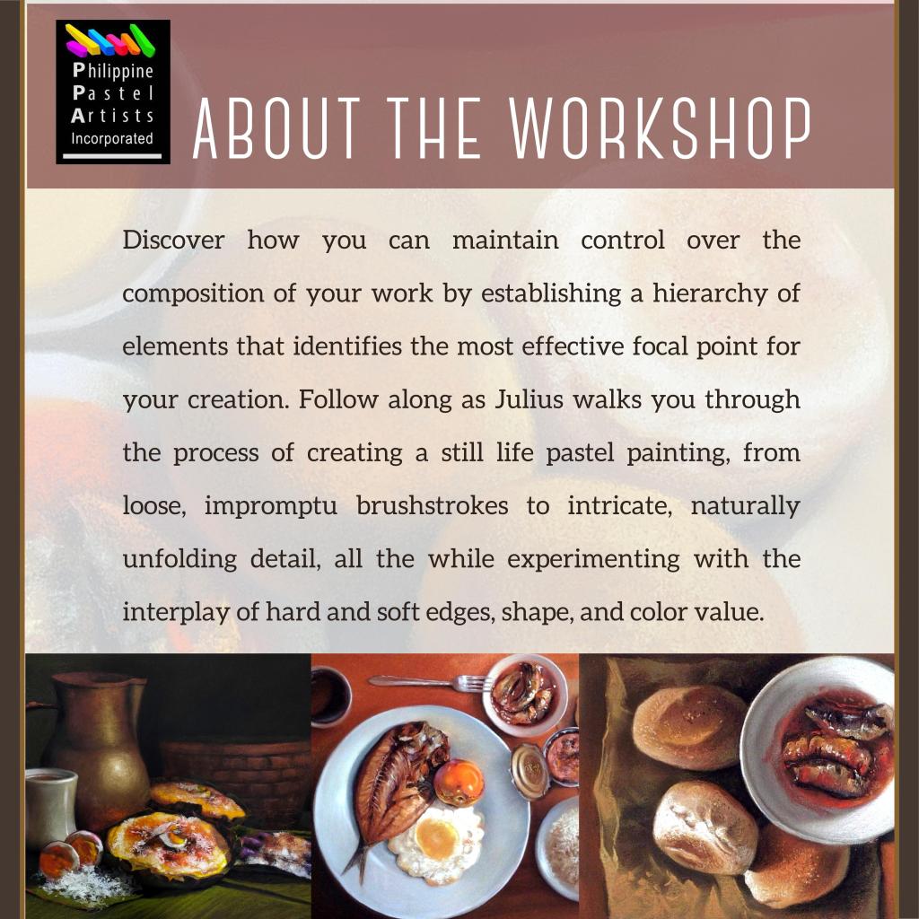 PPA is now accepting registrants for its upcoming Hagod Pastel workshop featuring PPA co-founder and board member Julius Legaspi. In his Pinoy Still Life session, learn how you can control your work’s composition by establishing a hierarchy of elements that reveals the best focal point for your work. Let Julius guide you in creating your still life pastel painting from broad spontaneous strokes to effortlessly unfolding detail through hard and soft edges as you play with form and color values. Julius Legaspi is known for his thoughtful color blending and mastery of expressive pastel painting in various Filipino-themed genres