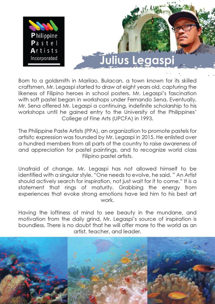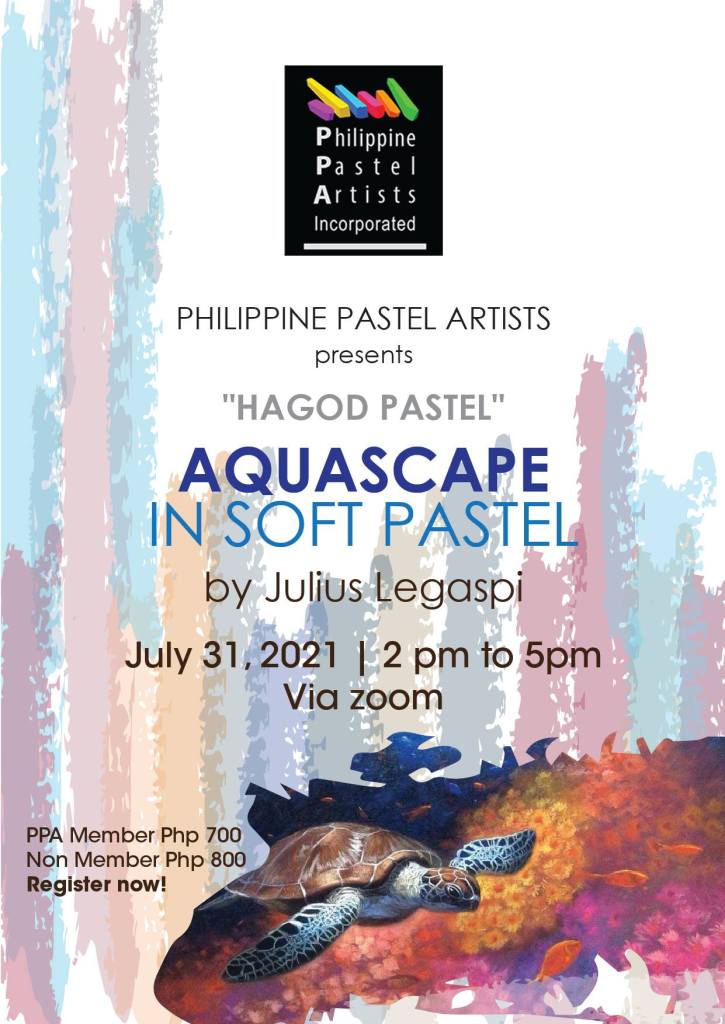 We are proud and truly excited to bring to you our second workshop in the “Hagod Pastel” series! Mark your calendars for July 31, as premier pastelist Julius Legaspi takes us through painting Aquascapes in this NOT TO MISS event. Will be viewed through a zoom session with a recording that will be sent to the participants. Still at a very low rate of Php 700 for members and Php 800 for non-members. Do not miss this chance to learn from the best through PPA online workshops.